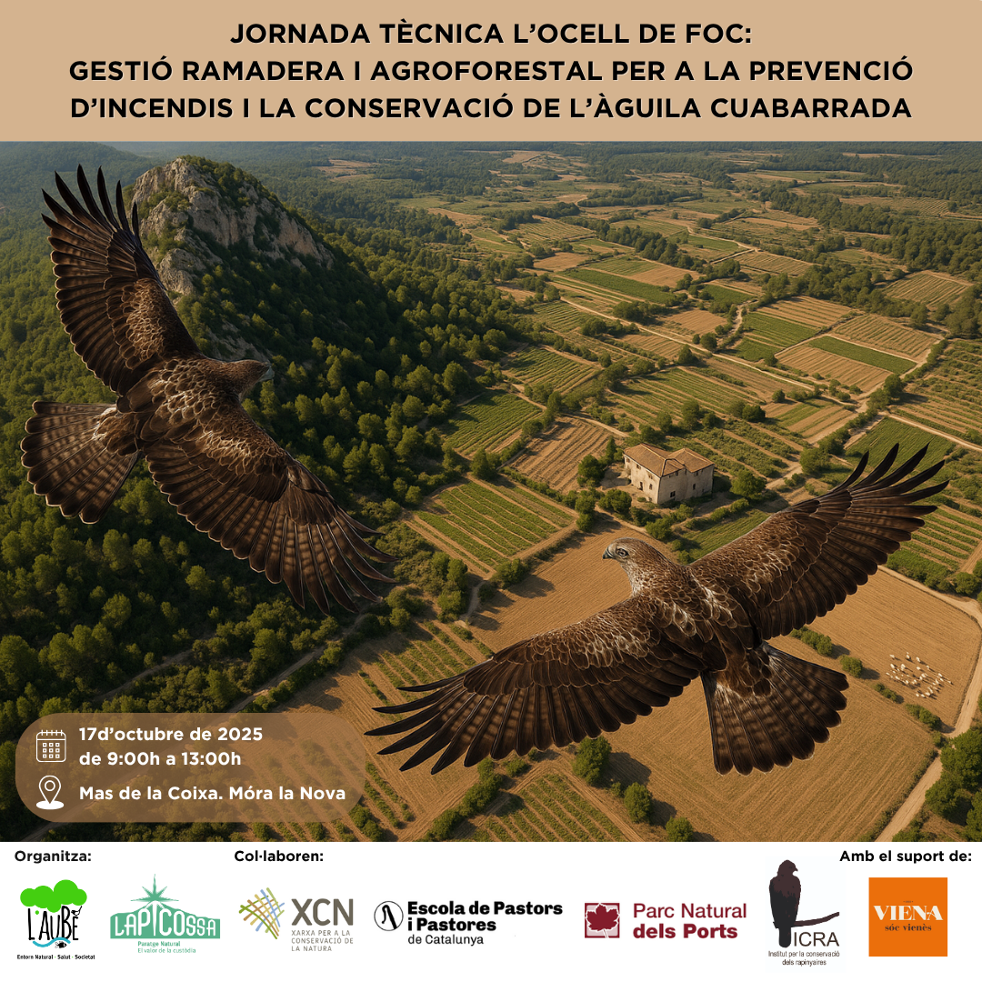 El proper divendres dia 17 d’octubre es durà a terme la Jornada tècnica final del projecte “L’ocell de foc – Gestió ramadera i agroforestal per a la prevenció d’incendis i la conservació de l’àguila cuabarrada”, finançat a través de la campanya d’arrodoniment dels restaurants Viena “Cèntim a cèntim prevenim els incendis” i coordinat per la Xarxa per a la Conservació de la Natura (XCN).
